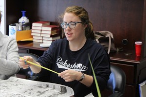 The Rev. Hannah Hooker learns to make palm crosses with members of her congregation. Hooker has led the congregation for less than a year. (photo by Destini Lattimore)