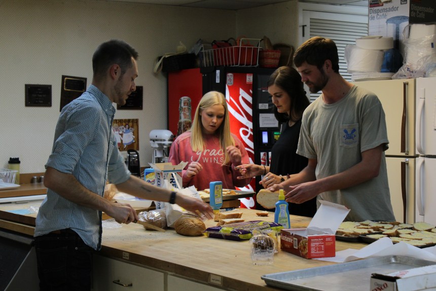 Members of the congregation gather together to prepare a meal for anyone in need. The church provides free meals every Saturday to the public. (photo by Destini Lattimore)