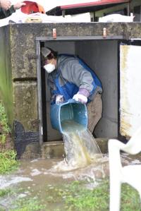 A member of the Arkansas Baptist State Convention Disaster Relief team helps remove water from flood-damaged homes. Other team members brought supplies to assist with the flood relief. (Photo by Darryl J. Kelley, courtesy of ABSC Disaster Relief)