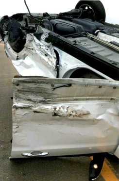 The wreckage of Strickland’s SUV. She keeps pictures on her cellphone as a testament to not text-and-drive and to wear a seat belt. Photo courtesy of the Strickland family