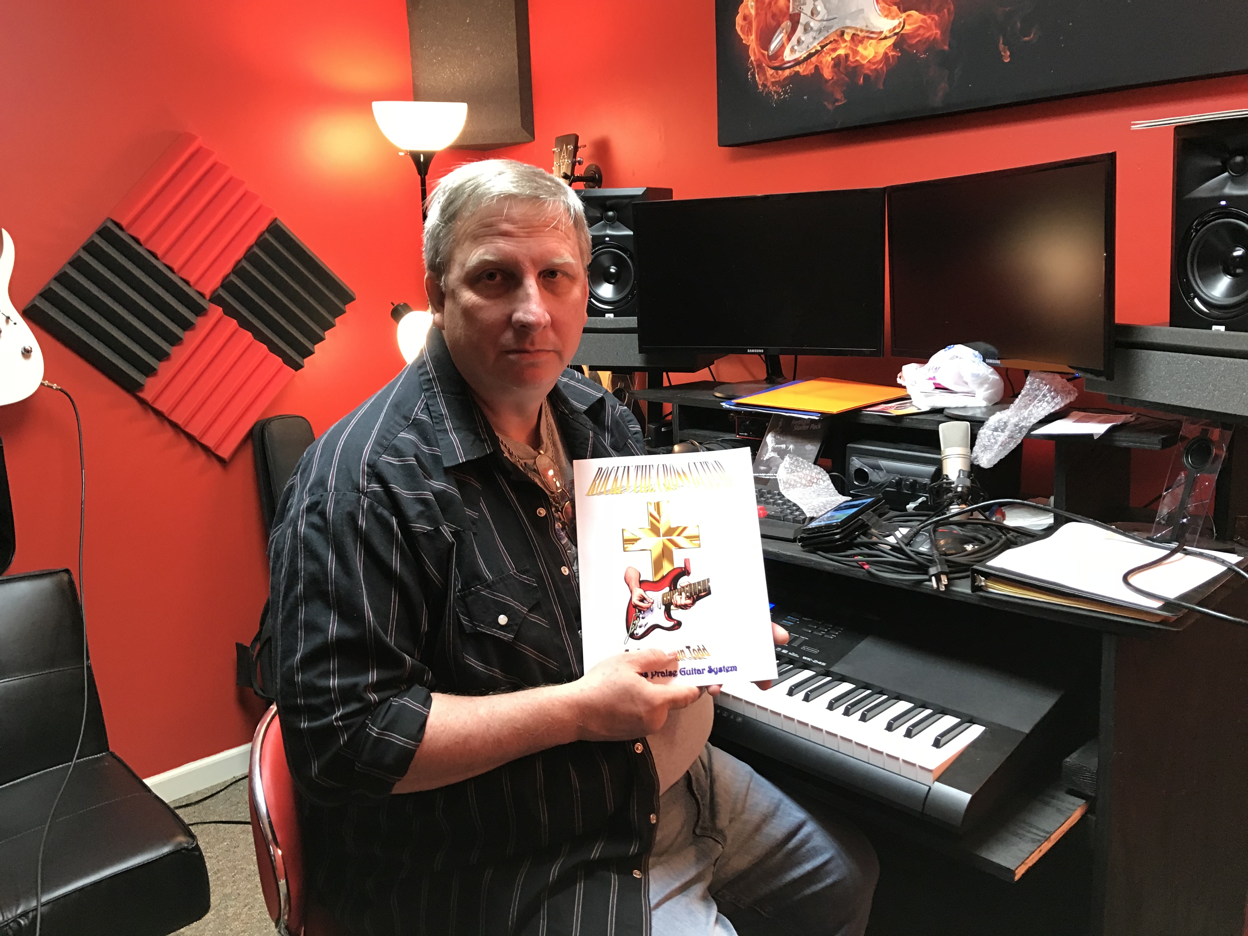 Todd sells his book, “Rockin’ the Cross Guitar,” on Amazon. He wrote it to help others easily learn to play. (photo by Christine Miyawa)