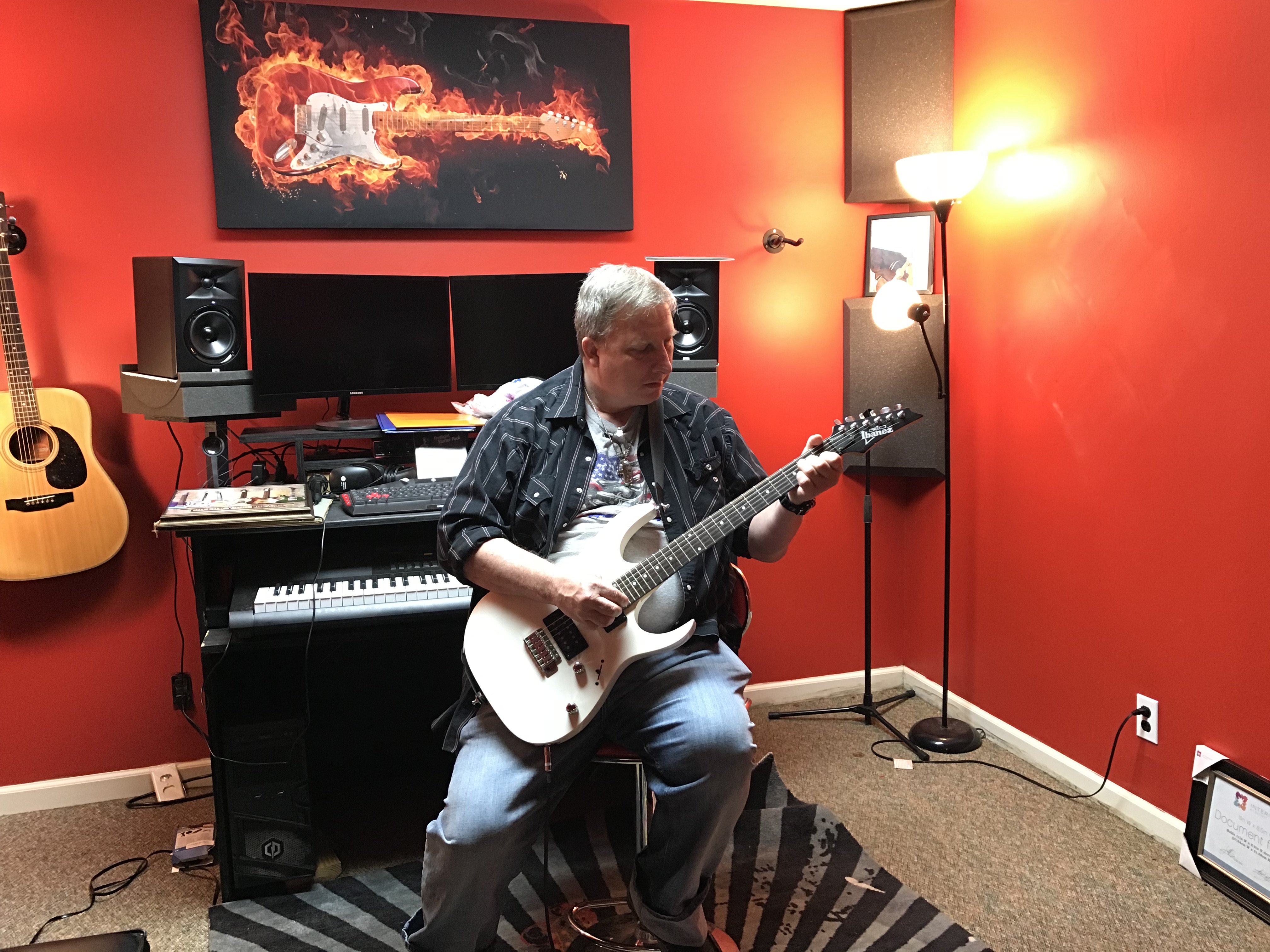 Adjacent to the door on the right, a small room with his guitar collection lining soundproof walls. Everything seemed carefully selected and arranged — red and black items made up his decor. Four speakers are strategically mounted in the room’s corners; two more rest on the table opposite the keyboard. That same table held two computer monitors. A long, black-leather sofa sits quietly adjacent to the door.