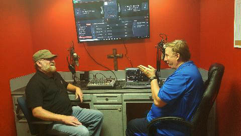 Todd (right) interviews Bret Harris during his web-based Christian radio show. Harris is a proponent of Gospel Bluegrass. (photo by Teresa Todd)