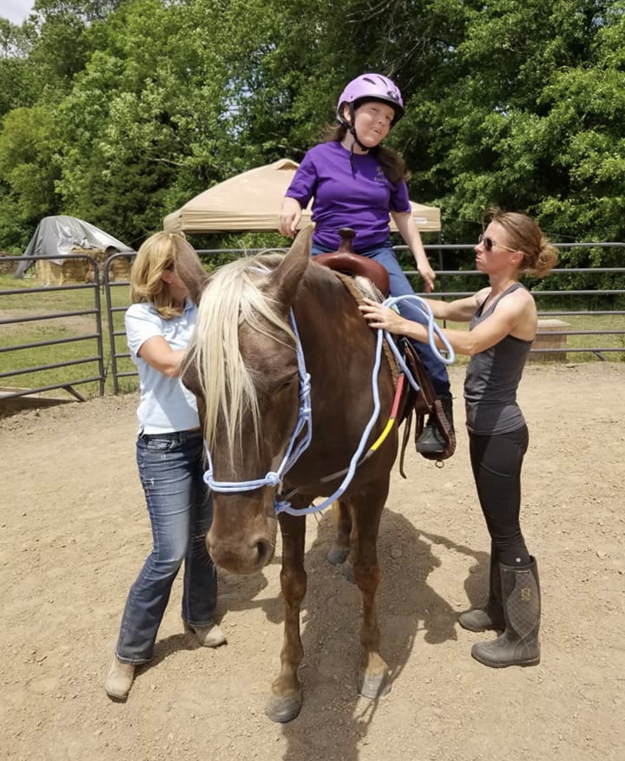 Jennifer Warzocha (l.) and Audrey Ganong (r.) help patient Ashlynn Holt ride a horse. Courtesy of Diego Ranch