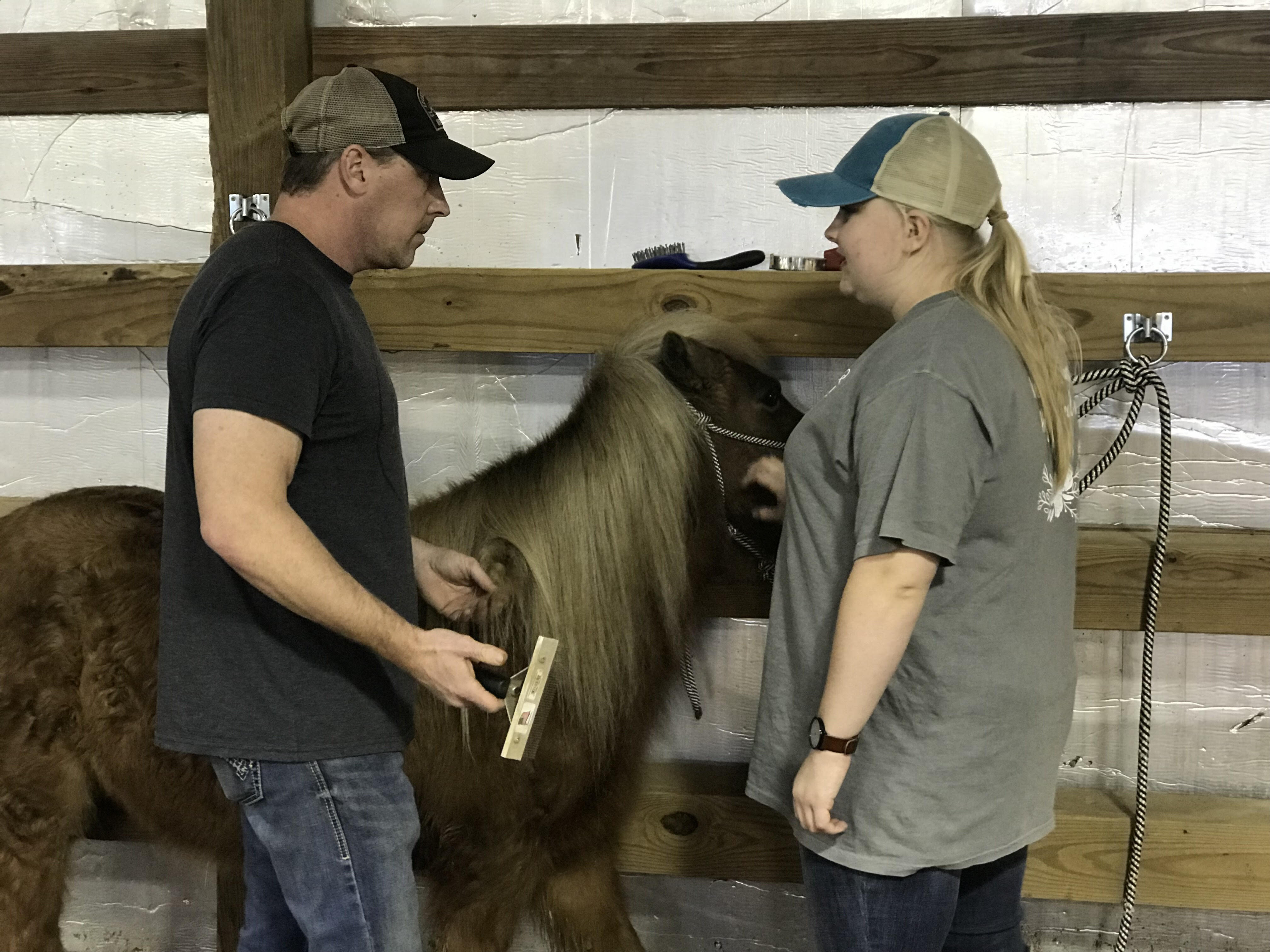 Diego Ranch owner Michael Jackson and student Kat Walton groom a Shetland pony. (photo by Ana Baquero)