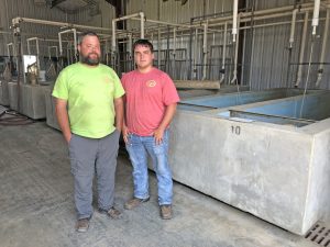 Robert Zimmer, left, and Erik Jordan pose by fish vats. Photo by Tristan Bennett