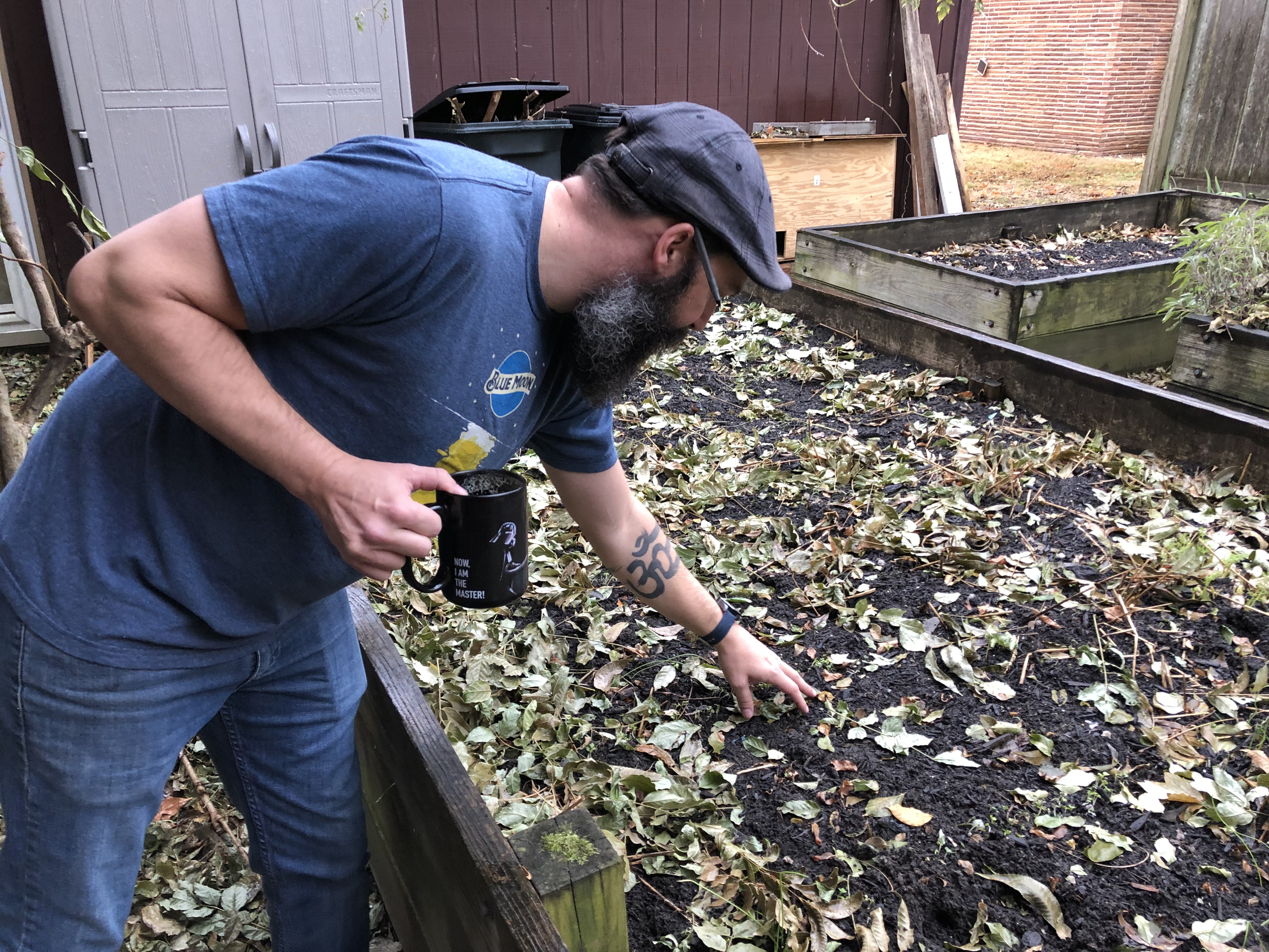 The Edge Coffee House owner Brian Nobles examines his shop’s gardens. Items grown in the gardens will be used for dishes at the Edge.