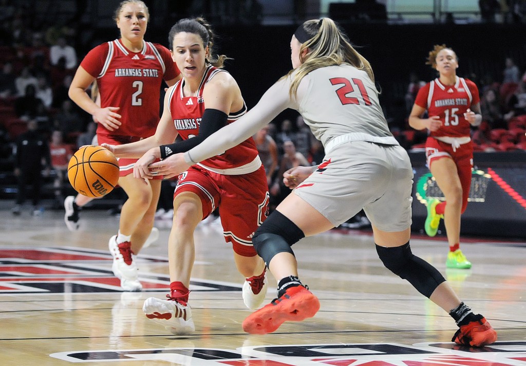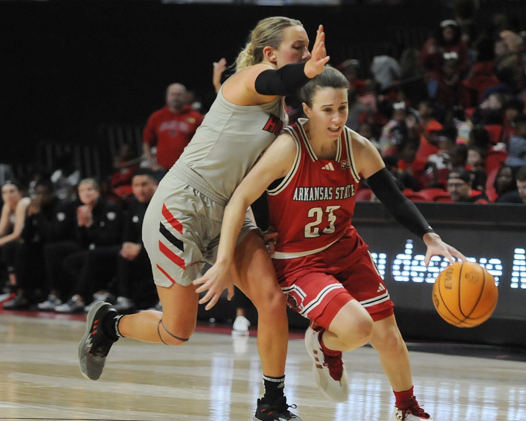 Red Wolves’ Izzy Higginbottom (23), left, drives the ball through Huskies’ Tara Stauffacher (21) during the game at First National Bank Arena. Higginbottom piled up 31 points and eight rebounds – both career highs – and handed out six assists to one turnover with four steals. A-State (1-1) outscored the Huskies (0-1) 44-29 in the second half after being behind 33-31 at intermission.