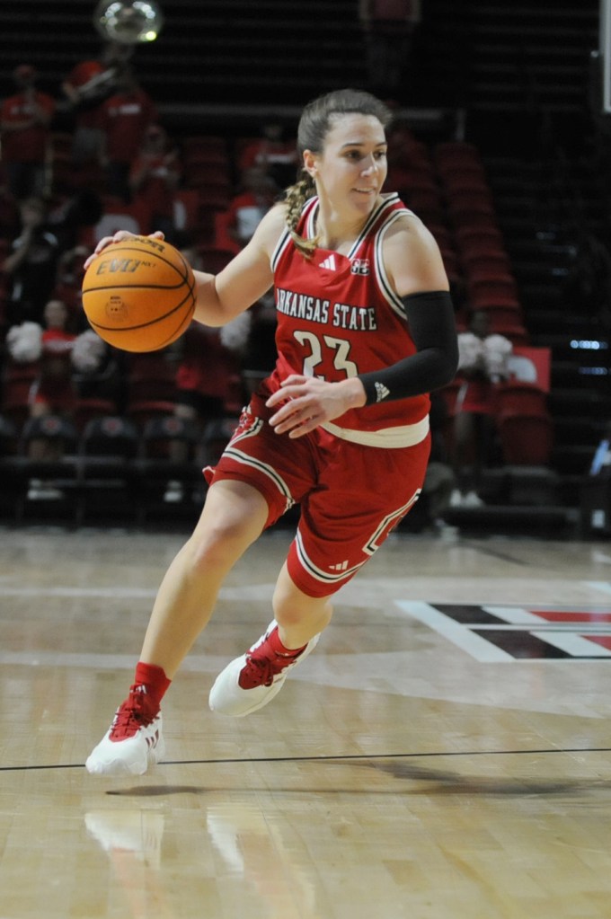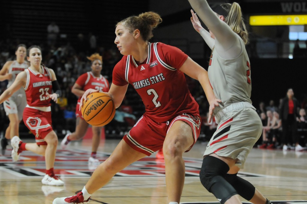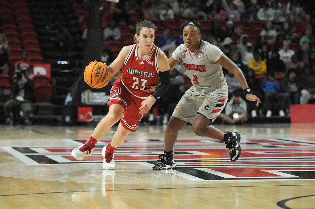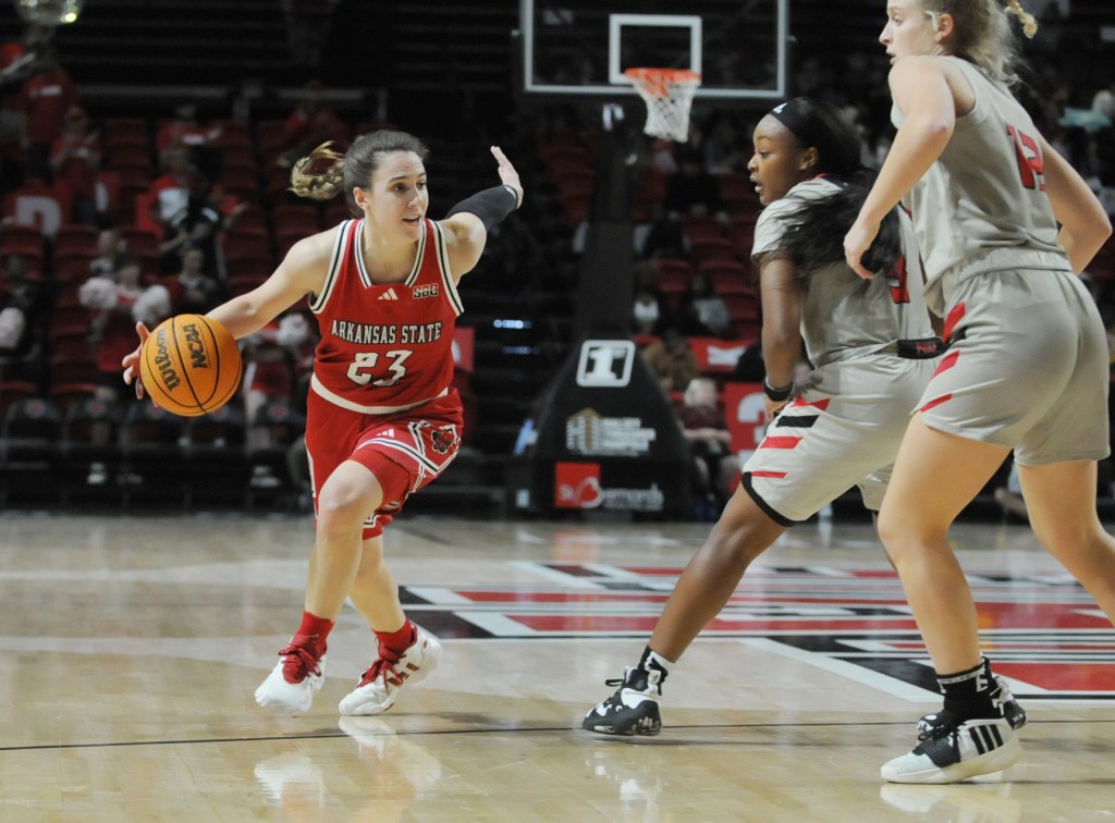 JONESBORO, Ark. – The Red Wolves women’s basketball team play against Northern Illinois University at First National Bank Arena Thursday, November 9, 2023. The Red Wolves beat the Huskies 75-62 during the MAC-SBC Challenge.Red Wolves’ Izzy Higginbottom (23), left, drives the ball through Huskies’ Tara Stauffacher (21) during the game at First National Bank Arena. Higginbottom piled up 31 points and eight rebounds – both career highs – and handed out six assists to one turnover with four steals. A-State (1-1) outscored the Huskies (0-1) 44-29 in the second half after being behind 33-31 at intermission.JONESBORO, Ark. – The Red Wolves women’s basketball team play against Northern Illinois University at First National Bank Arena Thursday, November 9, 2023. The Red Wolves beat the Huskies 75-62 during the MAC-SBC Challenge.JONESBORO, Ark. – The Red Wolves women’s basketball team play against Northern Illinois University at First National Bank Arena Thursday, November 9, 2023. The Red Wolves beat the Huskies 75-62 during the MAC-SBC Challenge.JONESBORO, Ark. – The Red Wolves women’s basketball team play against Northern Illinois University at First National Bank Arena Thursday, November 9, 2023. The Red Wolves beat the Huskies 75-62 during the MAC-SBC Challenge.JONESBORO, Ark. – The Red Wolves women’s basketball team play against Northern Illinois University at First National Bank Arena Thursday, November 9, 2023. The Red Wolves beat the Huskies 75-62 during the MAC-SBC Challenge.JONESBORO, Ark. – The Red Wolves women’s basketball team play against Northern Illinois University at First National Bank Arena Thursday, November 9, 2023. The Red Wolves beat the Huskies 75-62 during the MAC-SBC Challenge.JONESBORO, Ark. – The Red Wolves women’s basketball team play against Northern Illinois University at First National Bank Arena Thursday, November 9, 2023. The Red Wolves beat the Huskies 75-62 during the MAC-SBC Challenge.JONESBORO, Ark. – The Red Wolves women’s basketball team play against Northern Illinois University at First National Bank Arena Thursday, November 9, 2023. The Red Wolves beat the Huskies 75-62 during the MAC-SBC Challenge.JONESBORO, Ark. – The Red Wolves women’s basketball team play against Northern Illinois University at First National Bank Arena Thursday, November 9, 2023. The Red Wolves beat the Huskies 75-62 during the MAC-SBC Challenge.