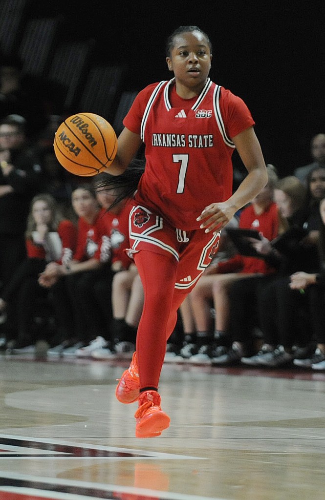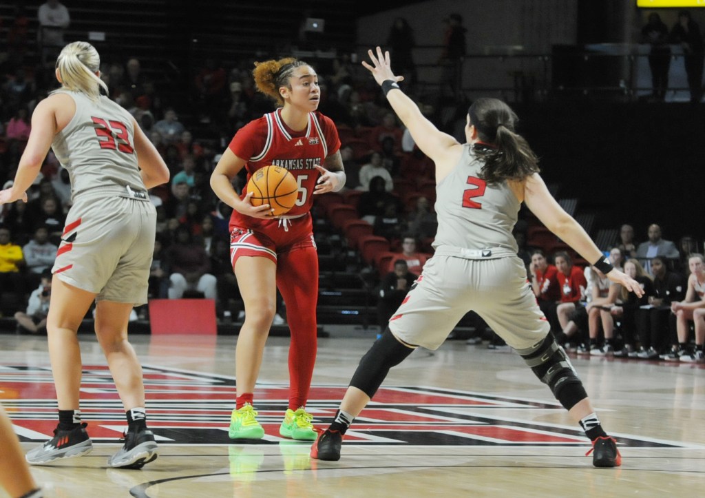 JONESBORO, Ark. – The Red Wolves women’s basketball team play against Northern Illinois University at First National Bank Arena in Jonesboro on Thursday, November 9, 2023. The Red Wolves beat the Huskies 75-62 during the MAC-SBC Challenge.