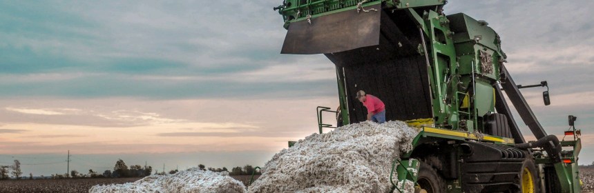 With cotton production at a 38 year low, Logan Dewitt and his father Allen (not pictured) experience technical difficulties with their picking machine in the cotton field on Nov. 5, 2015. The cotton picking machine fails to wrap the cotton, causing it to fall out unpackaged. This creates an unwanted delay for the farmers, as…