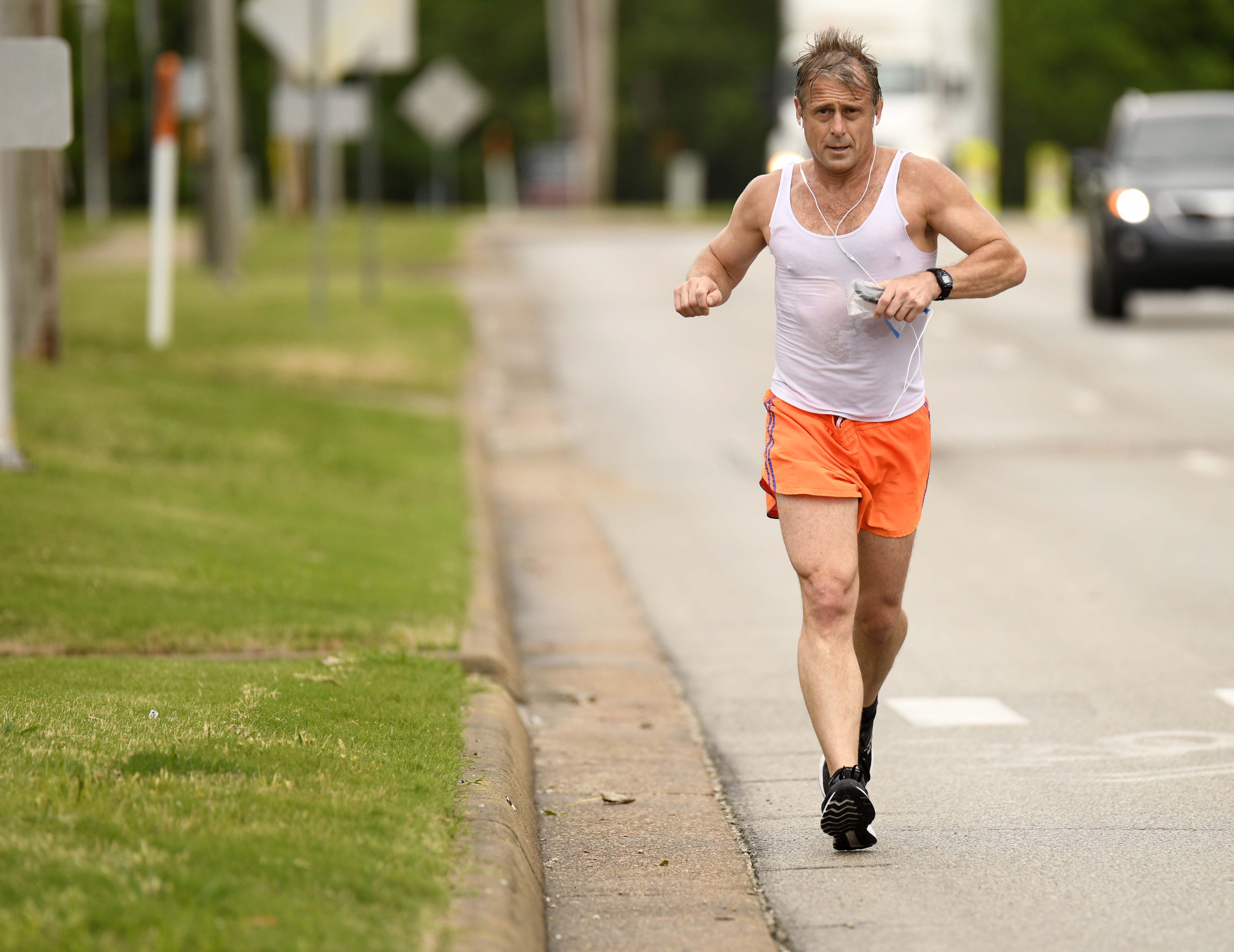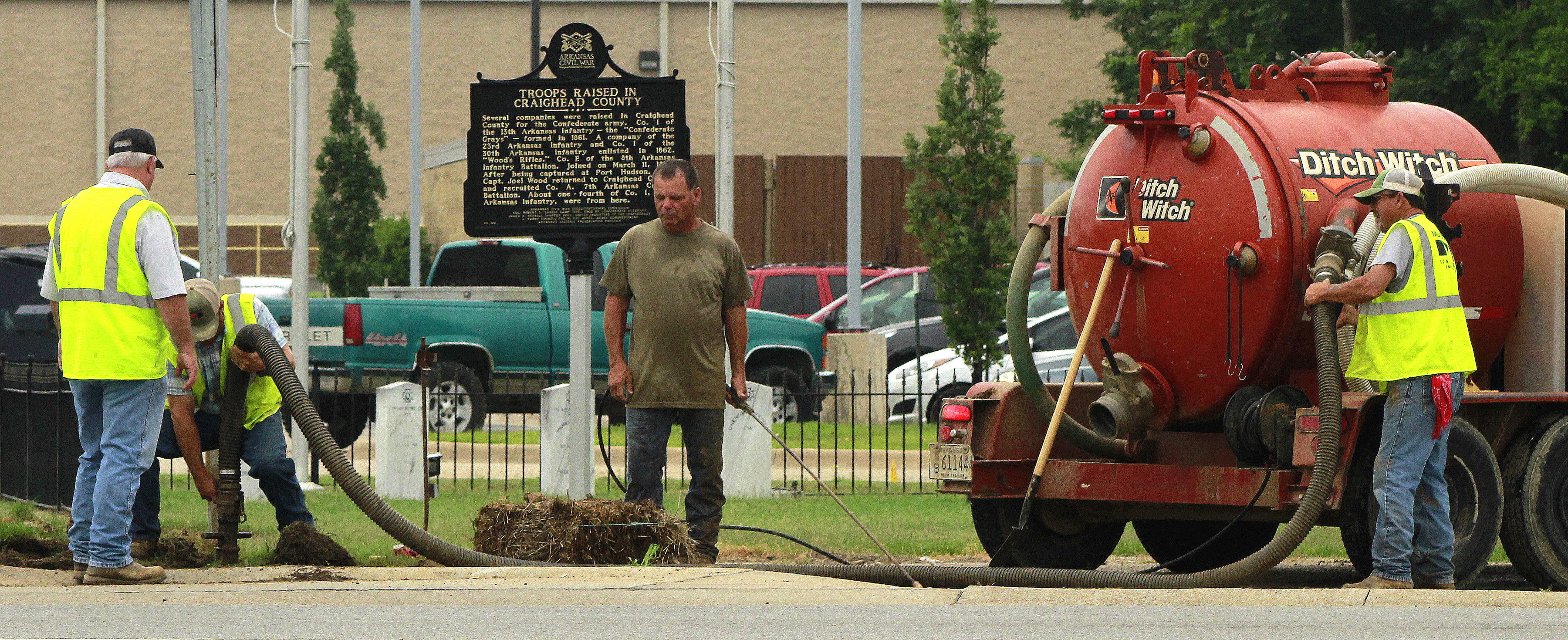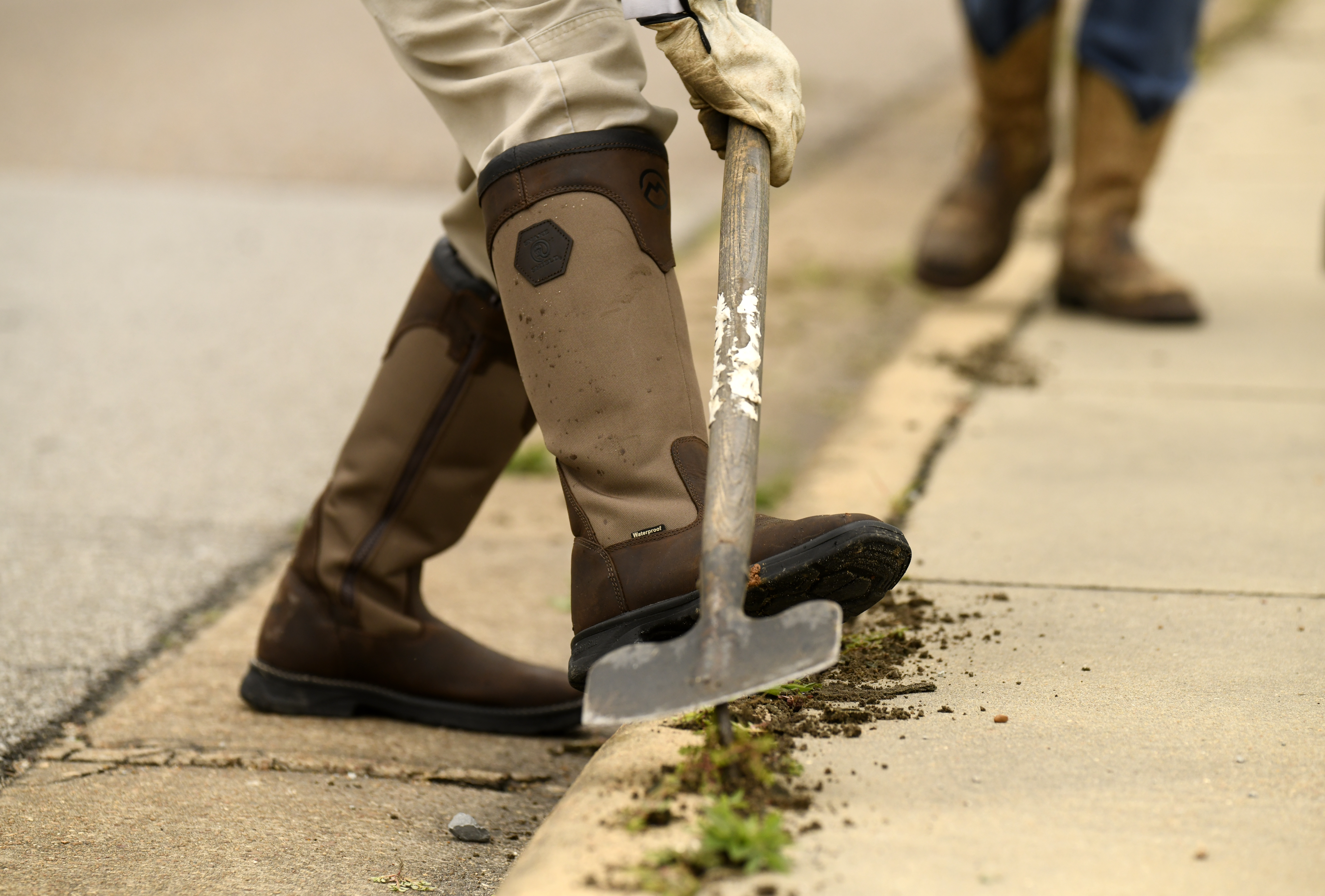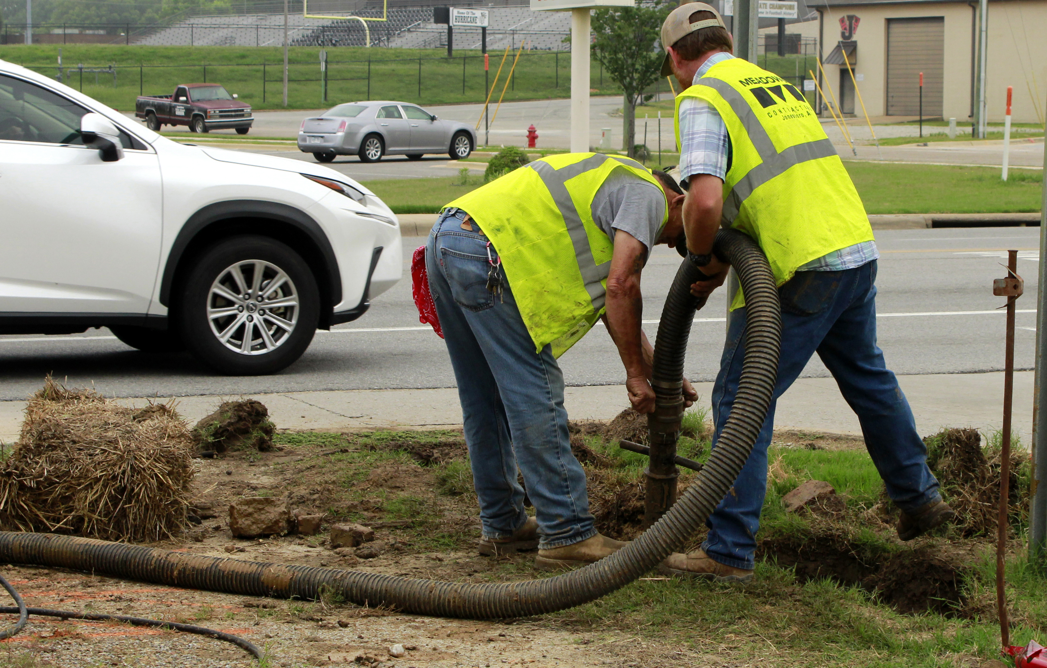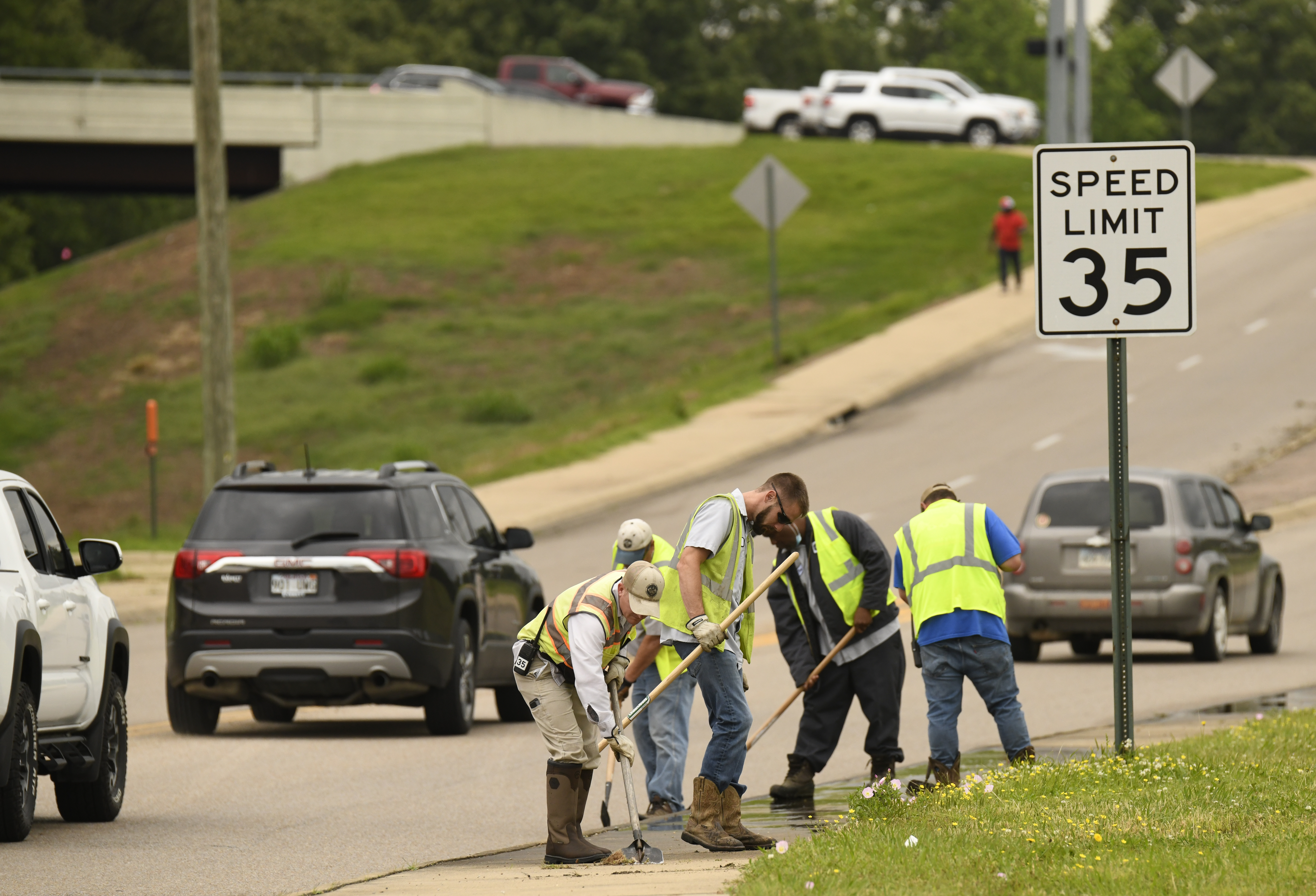 City of Jonesboro Street Department employees perform sidewalk maintenance along the 1700 block of East Washington Avenue near the intersection with Marion Berry Parkway and East Matthews Avenue on Tuesday, May 18, 2021. Citywide, workers were performing maintenance after Monday’s rains. Photos by Rangsiya Faihin