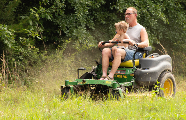 SEARCHING FOR BLACKBERRIES | Barry Morphis along with his 23-month-old grandson, Joseph, share a riding mow while searching for blackberries on Medallion Circle in Jonesboro, Monday, May 24, 2021. “Every time we have him, I get him out here,” said Morphis. “He likes riding…we get him once every week or two. Morphis said Joseph loves riding. “We just get out and enjoy the day.” Rangsiya Faihin/Delta Digital News Service